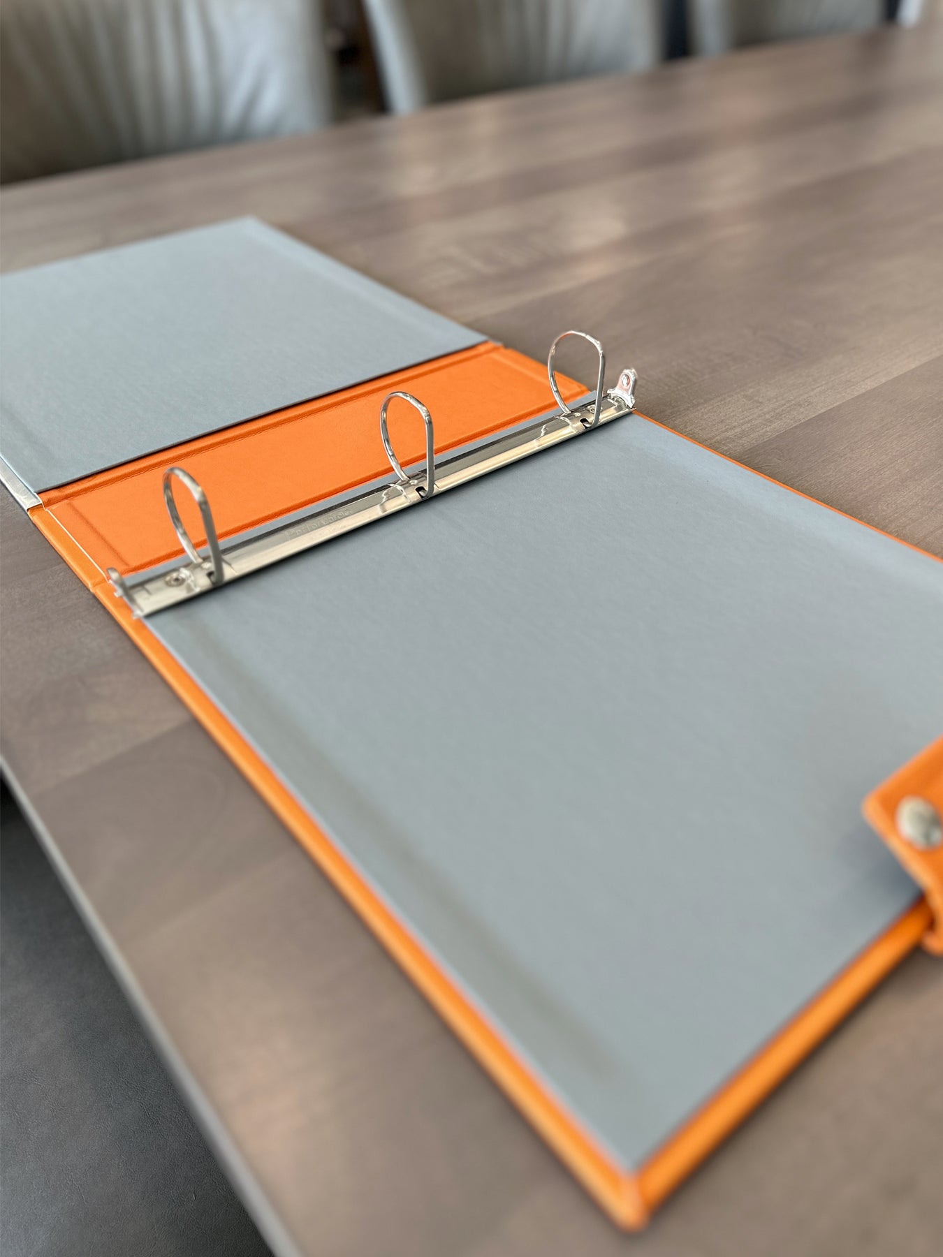 Shell aluminum riveted to orange faux leather spine and back cover. Large strap with double snap closure to keep binder closed. Grey linen interior with large 3-ring system. Embossed logo and artwork on front cover.
