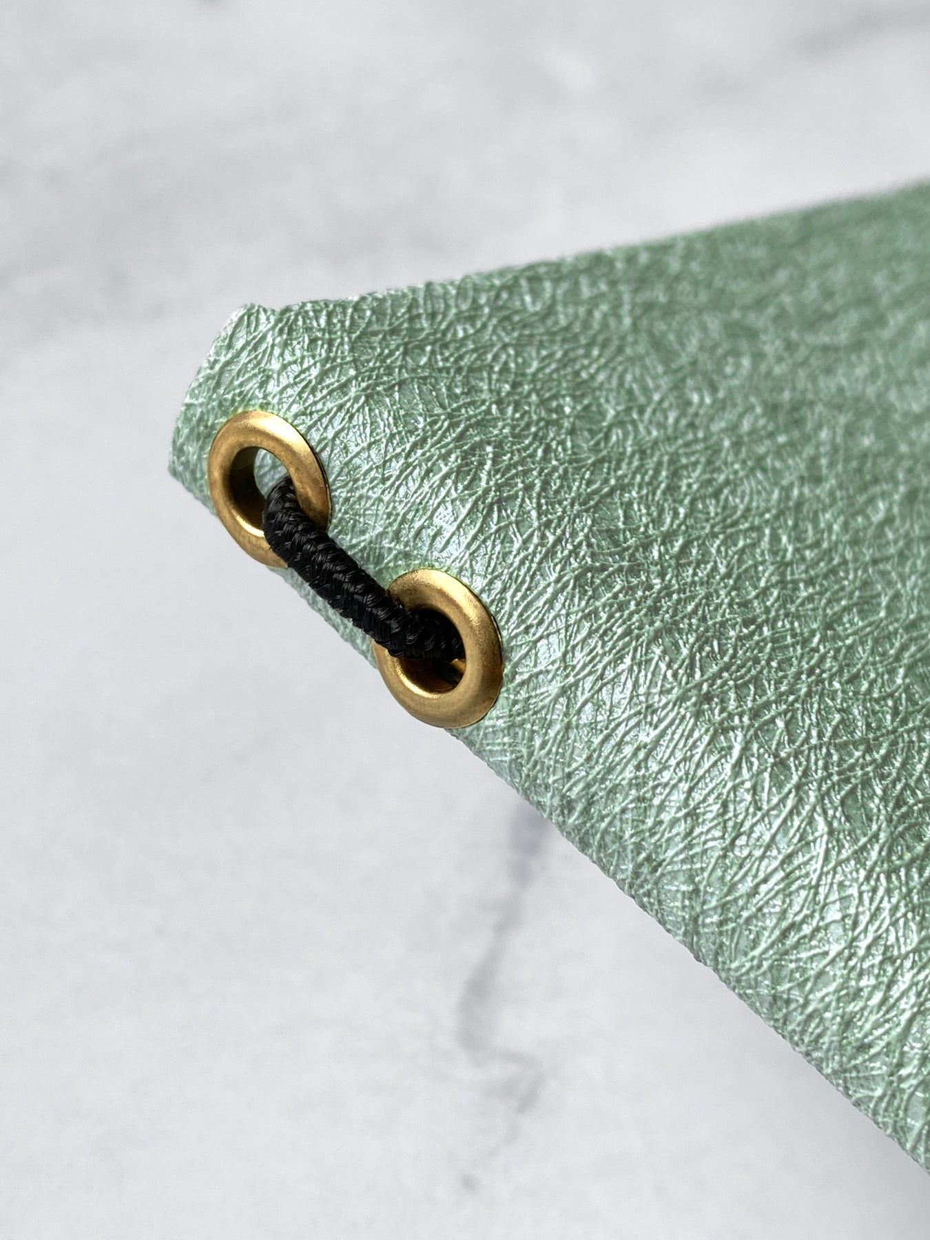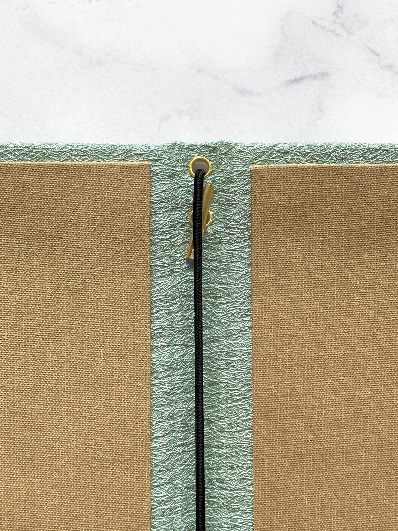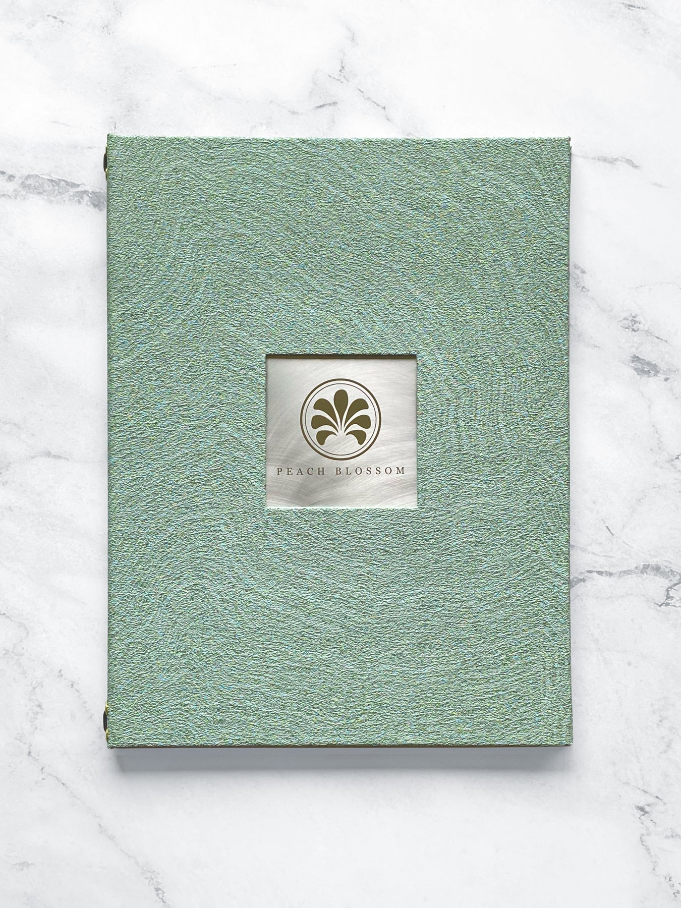 Light Aqua, vinyl menu cover with square, die-cut window and shell aluminum insert inside window. One color logo printed on shell aluminum insert. Brown linen interior with brass eyelets and black elastic in spine to hold menu pages.