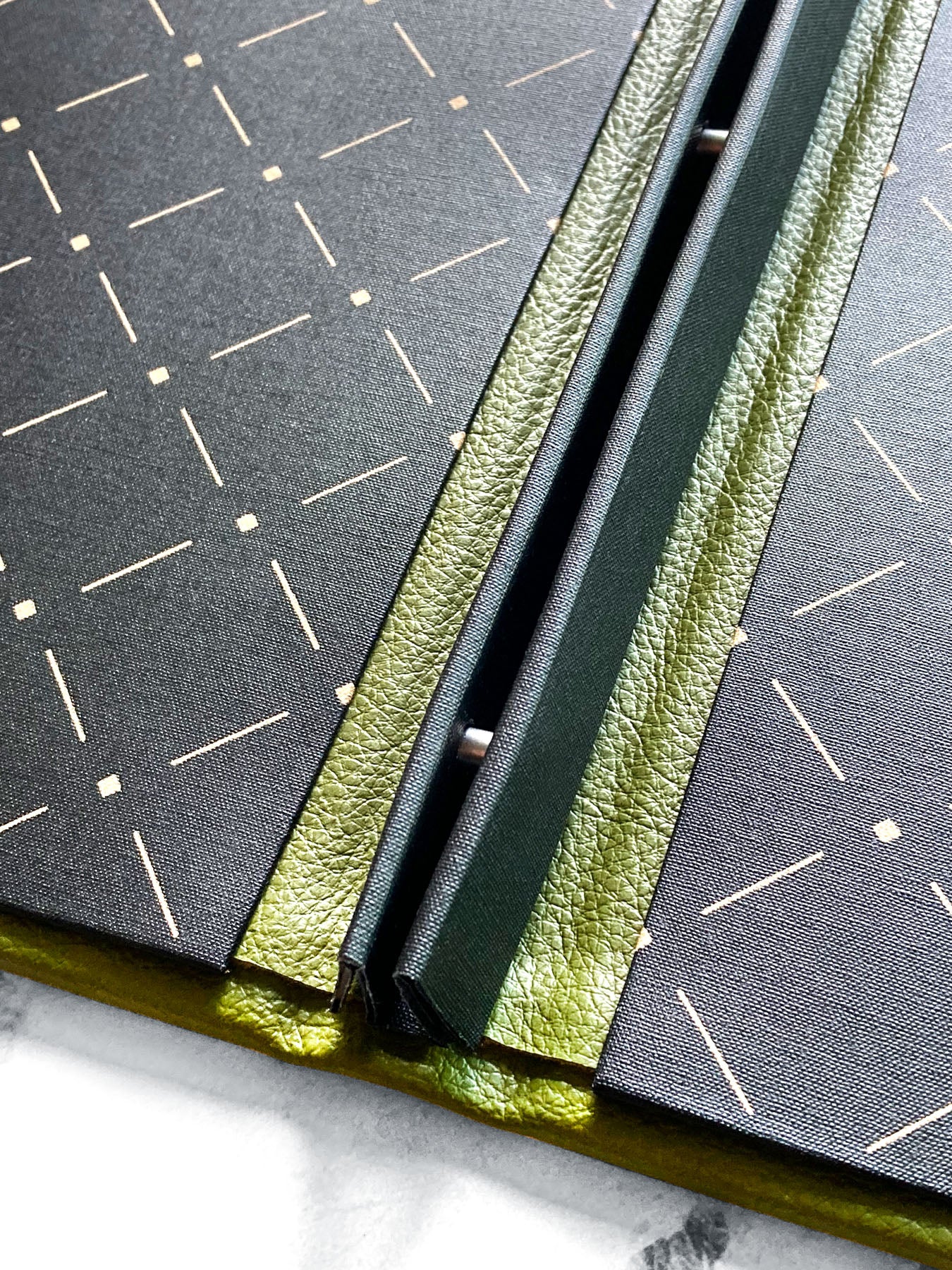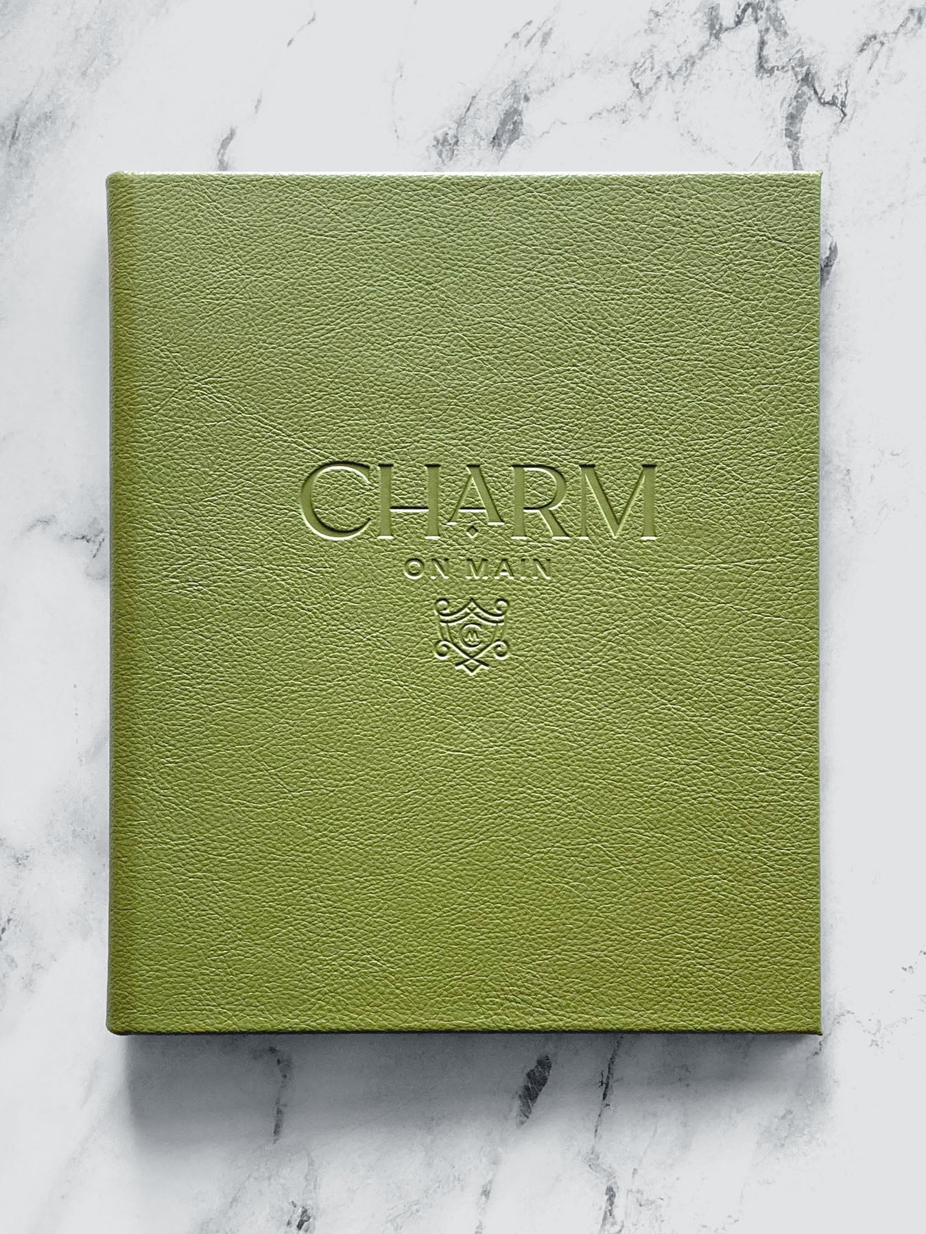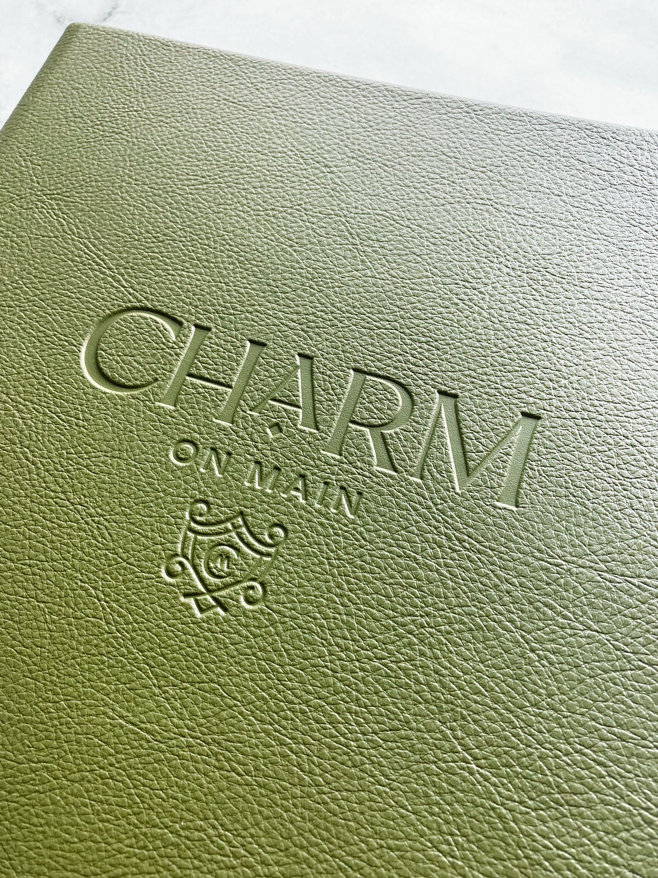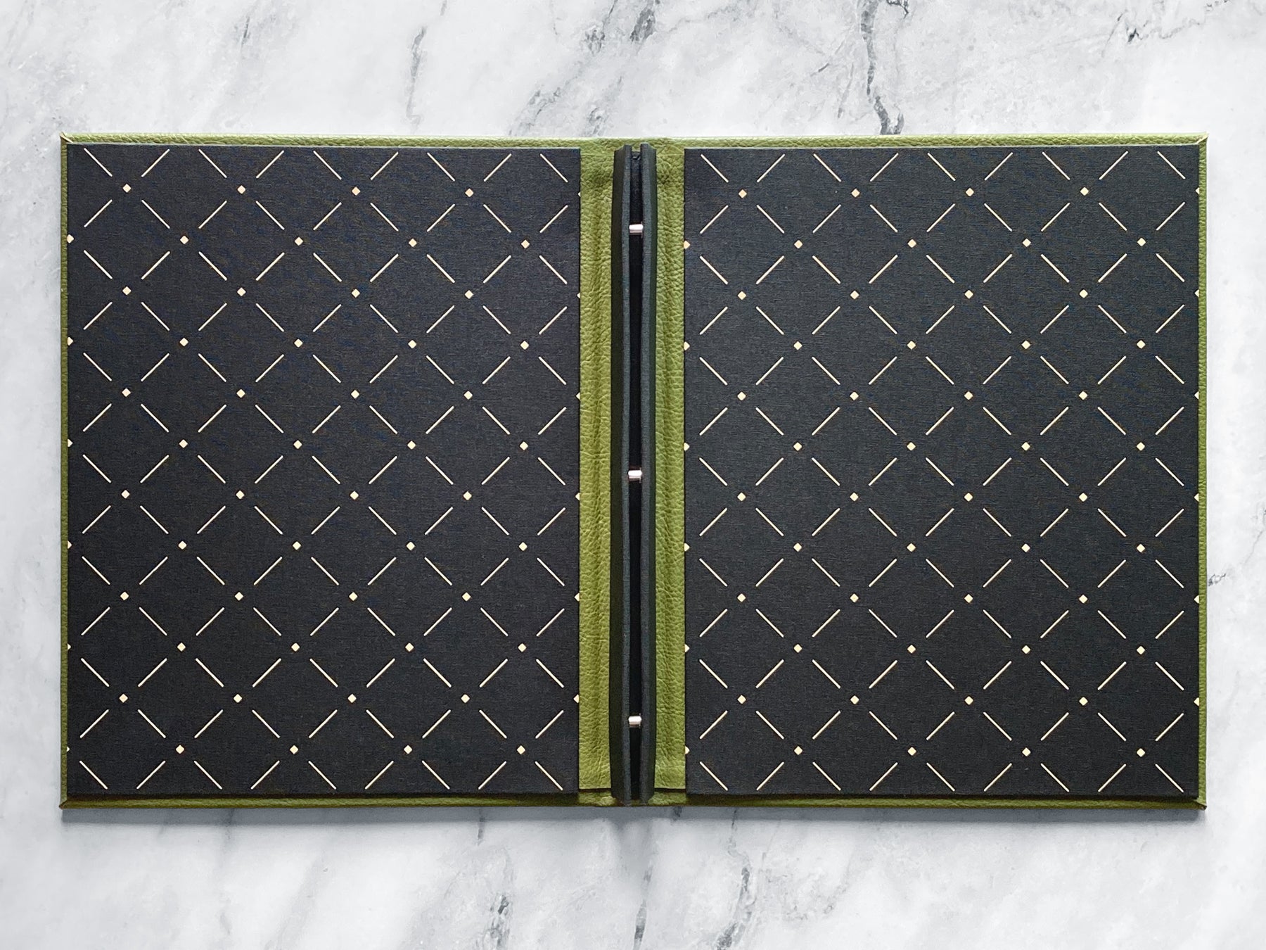 Green faux leather menu cover with tan printed pattern on black linen interior, and concealed post and screw system to hold menu pages. Blind stamped logo on front cover.