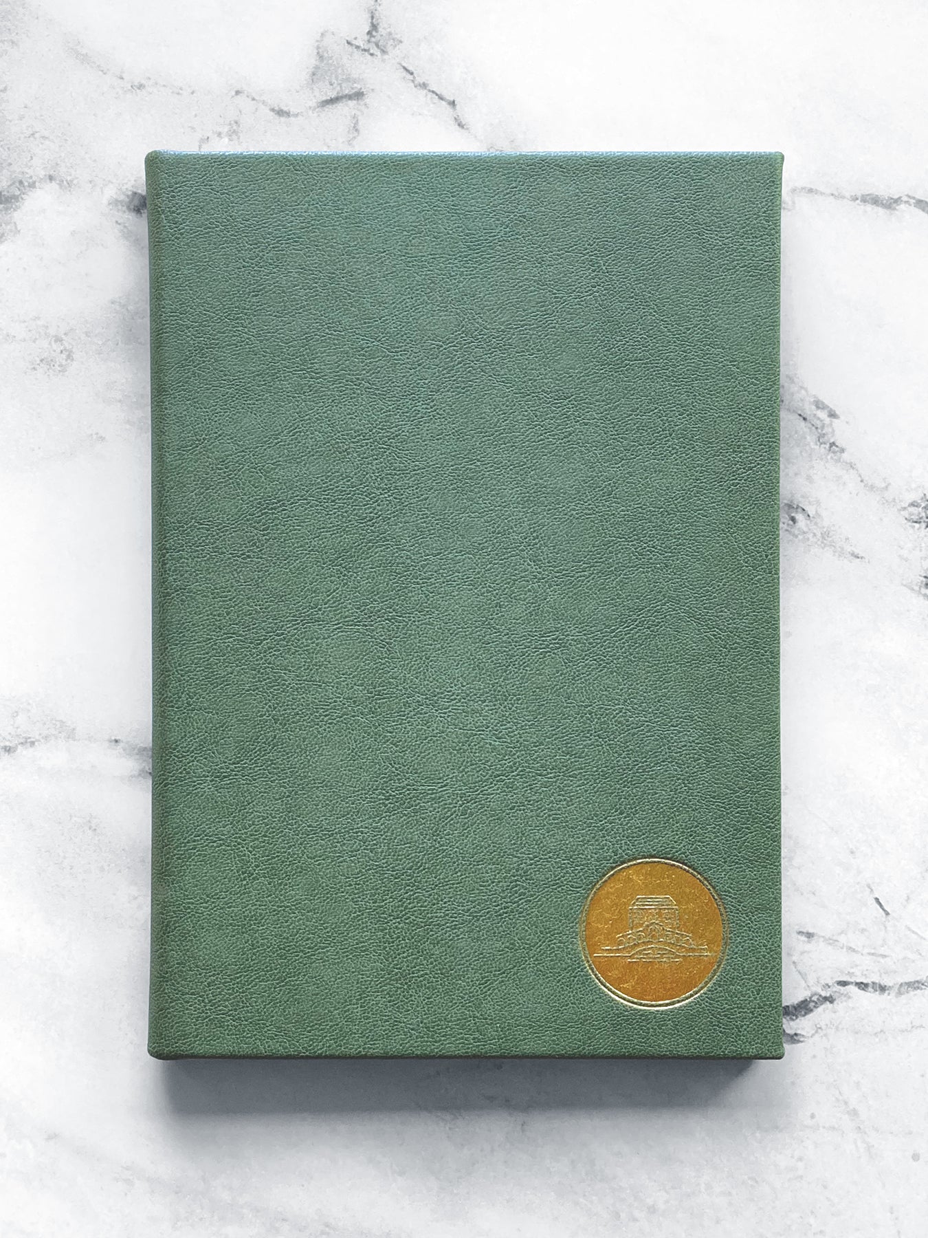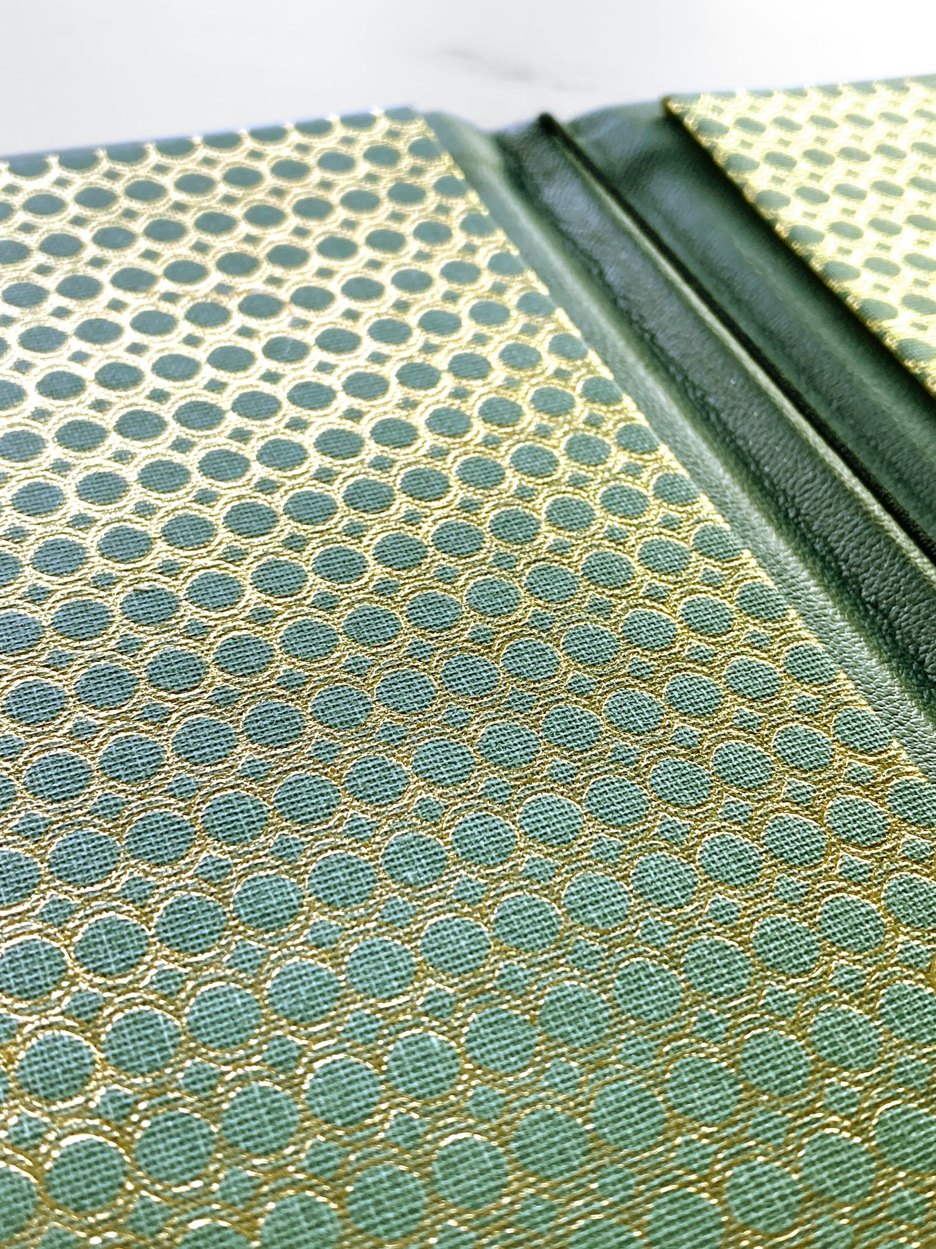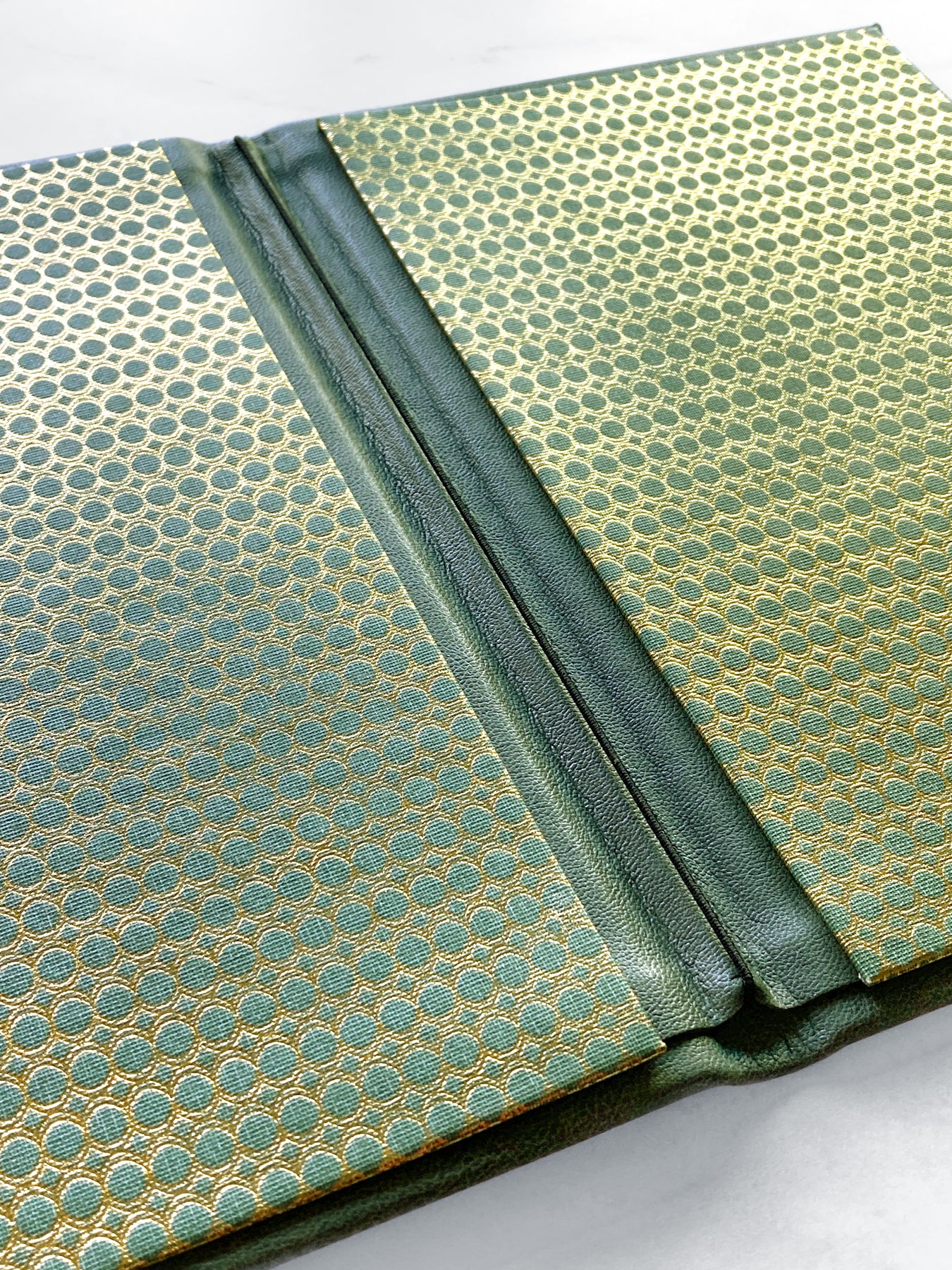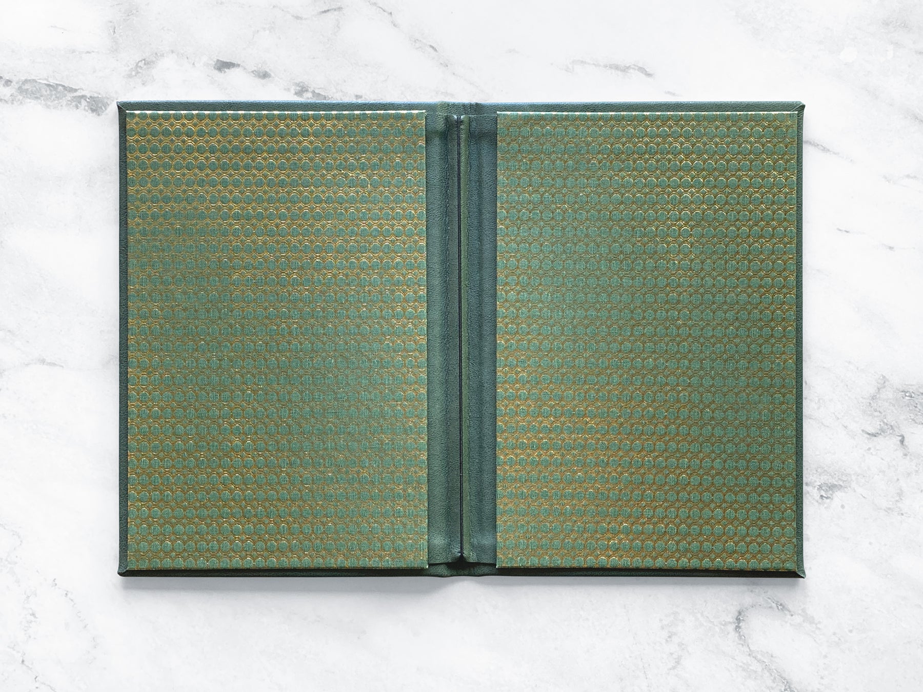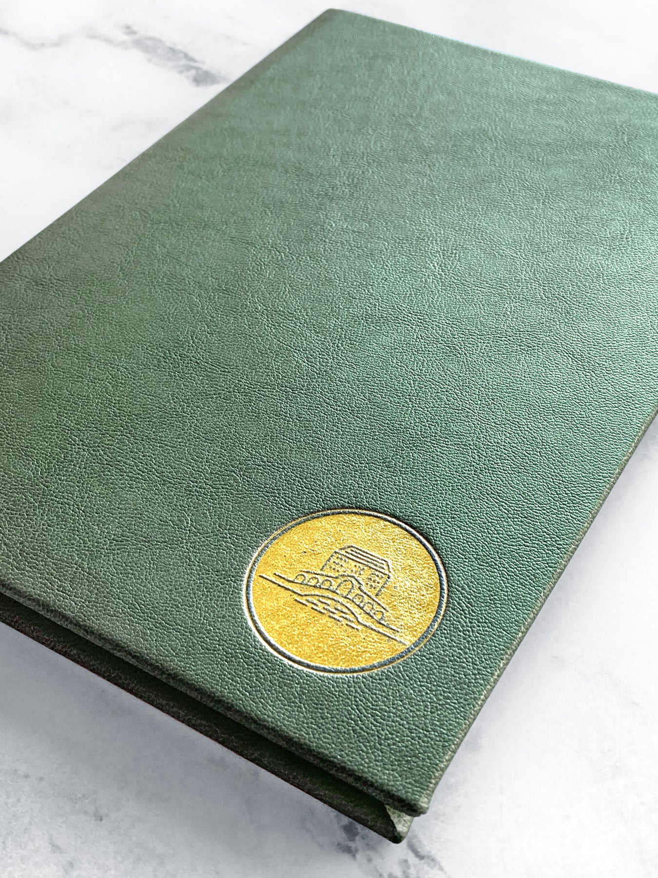 Muted green faux leather menu cover and gold foil stamped pattern on green linen interior with concealed elastic system to hold menu pages. Gold foil stamped logo on front cover