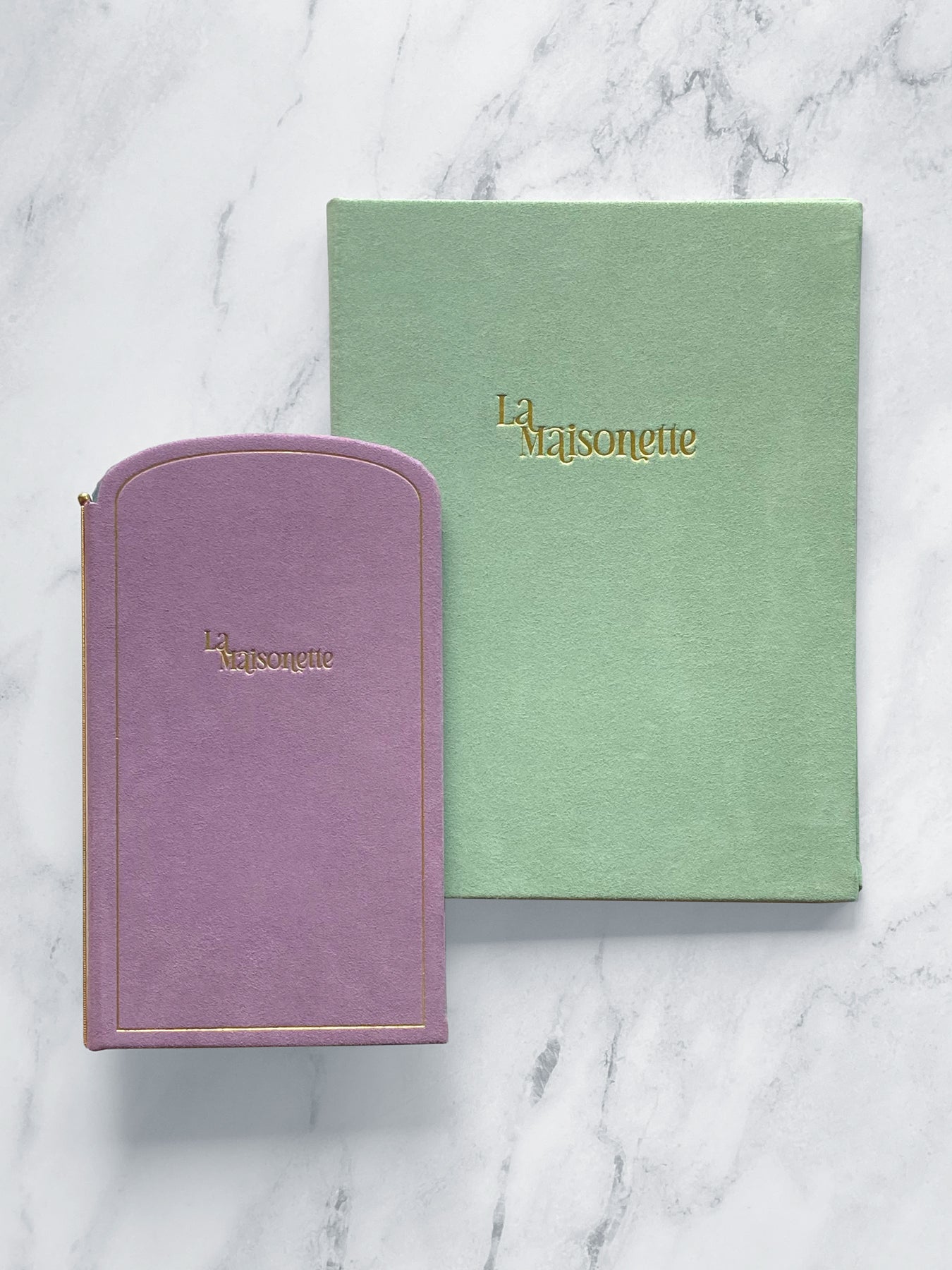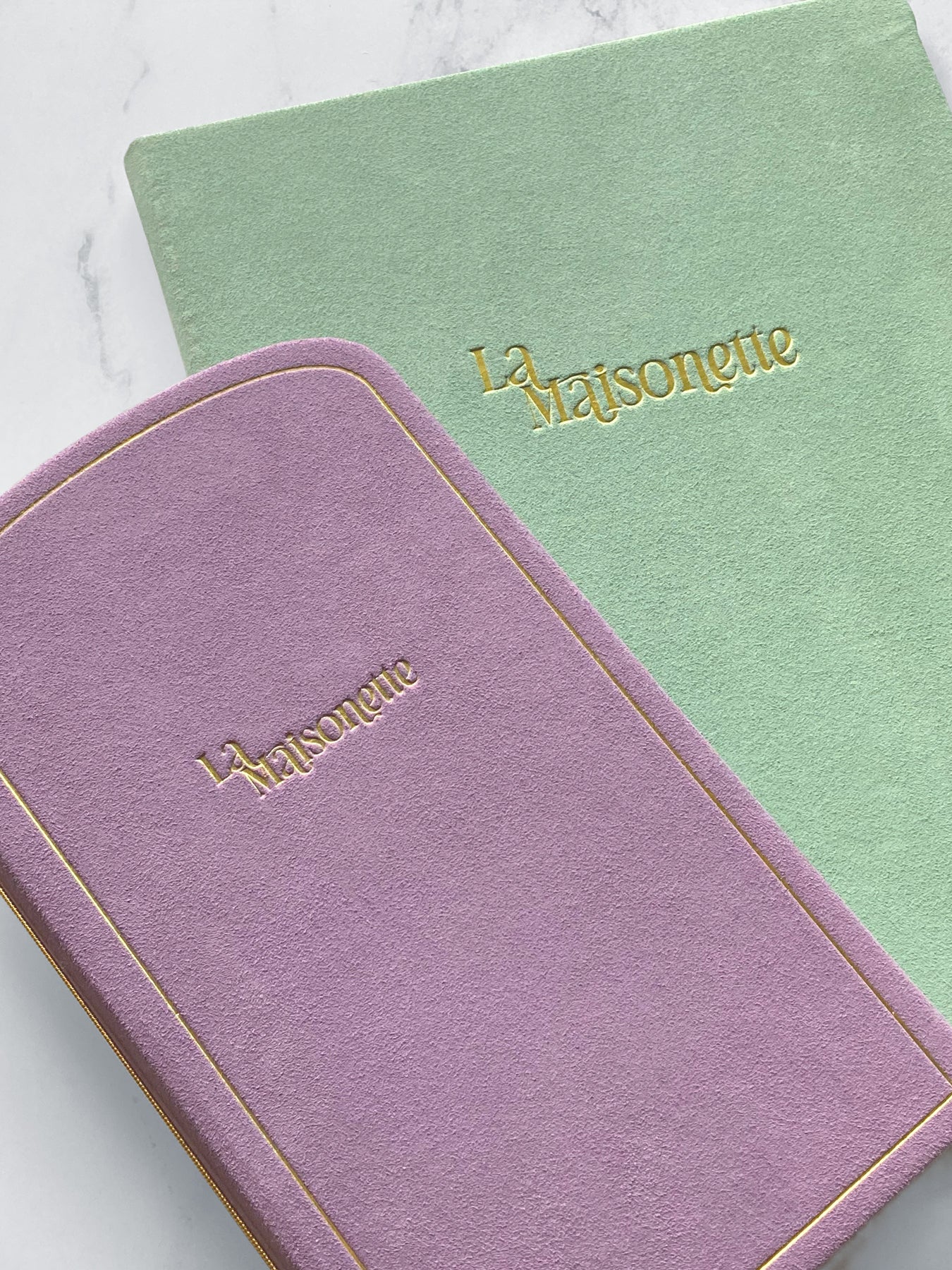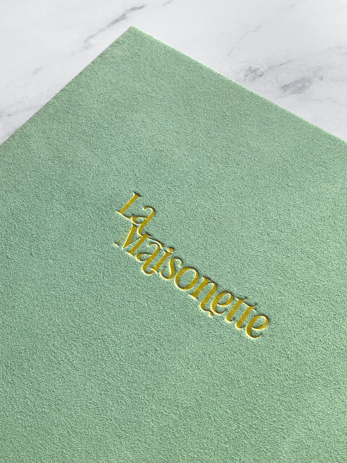 Light teal and lavender faux suede menu collection. Lavender, die-cut menu cover with printed interior and exposed elastic to hold menu pages. Light teal menu cover with printed interior and concealed elastic in spine to hold menu pages. Both have gold foil stamped artwork and logo on front covers.