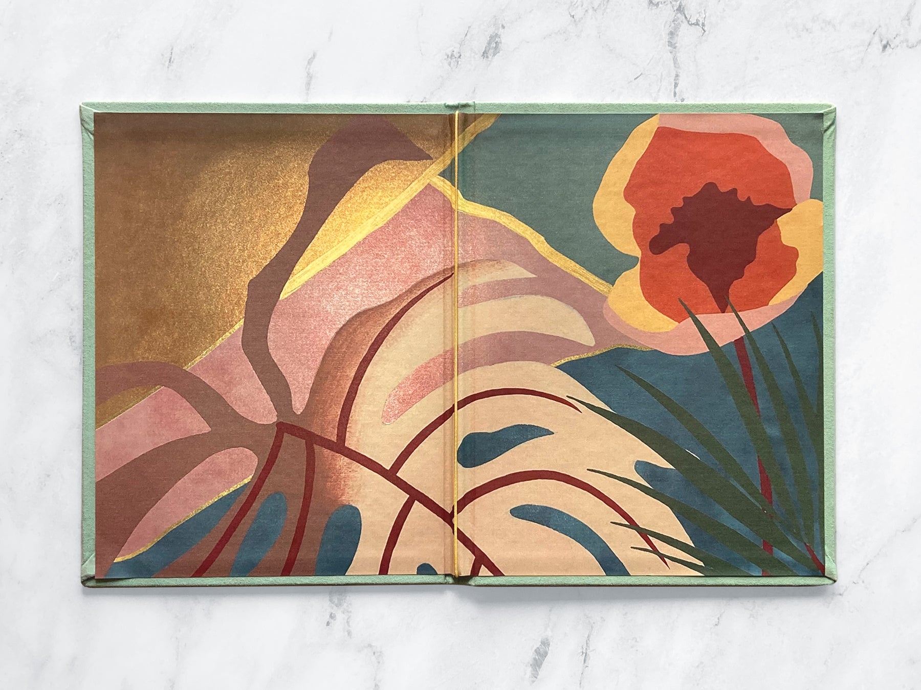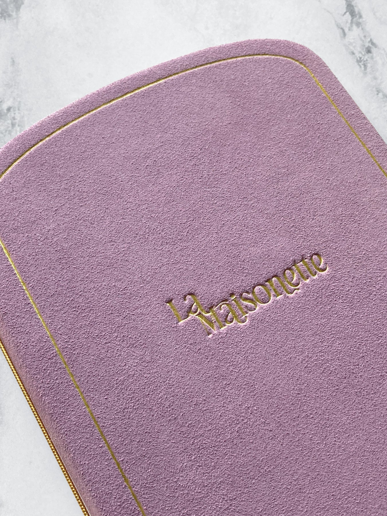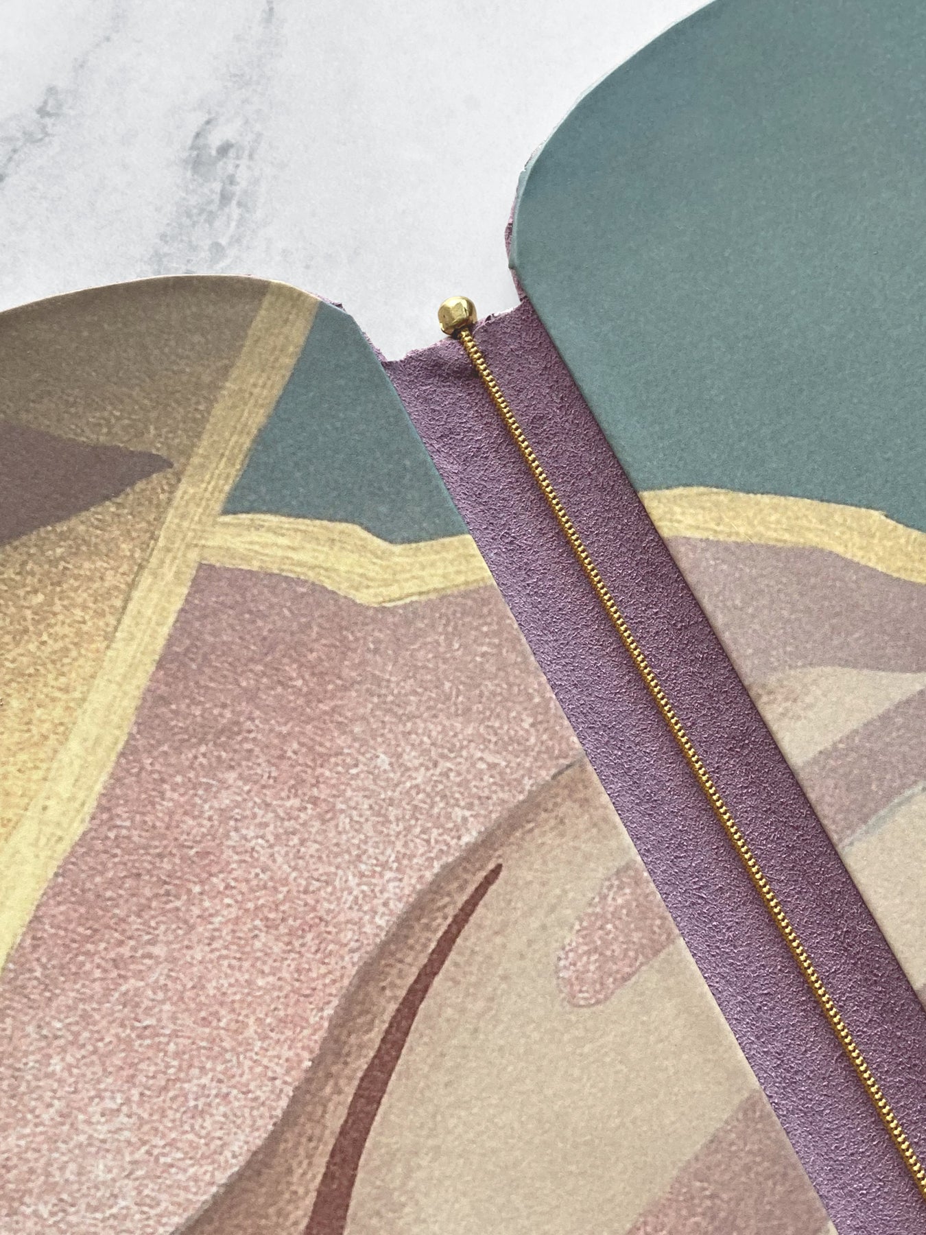 Light teal and lavender faux suede menu collection. Lavender, die-cut menu cover with printed interior and exposed elastic to hold menu pages. Light teal menu cover with printed interior and concealed elastic in spine to hold menu pages. Both have gold foil stamped artwork and logo on front covers.