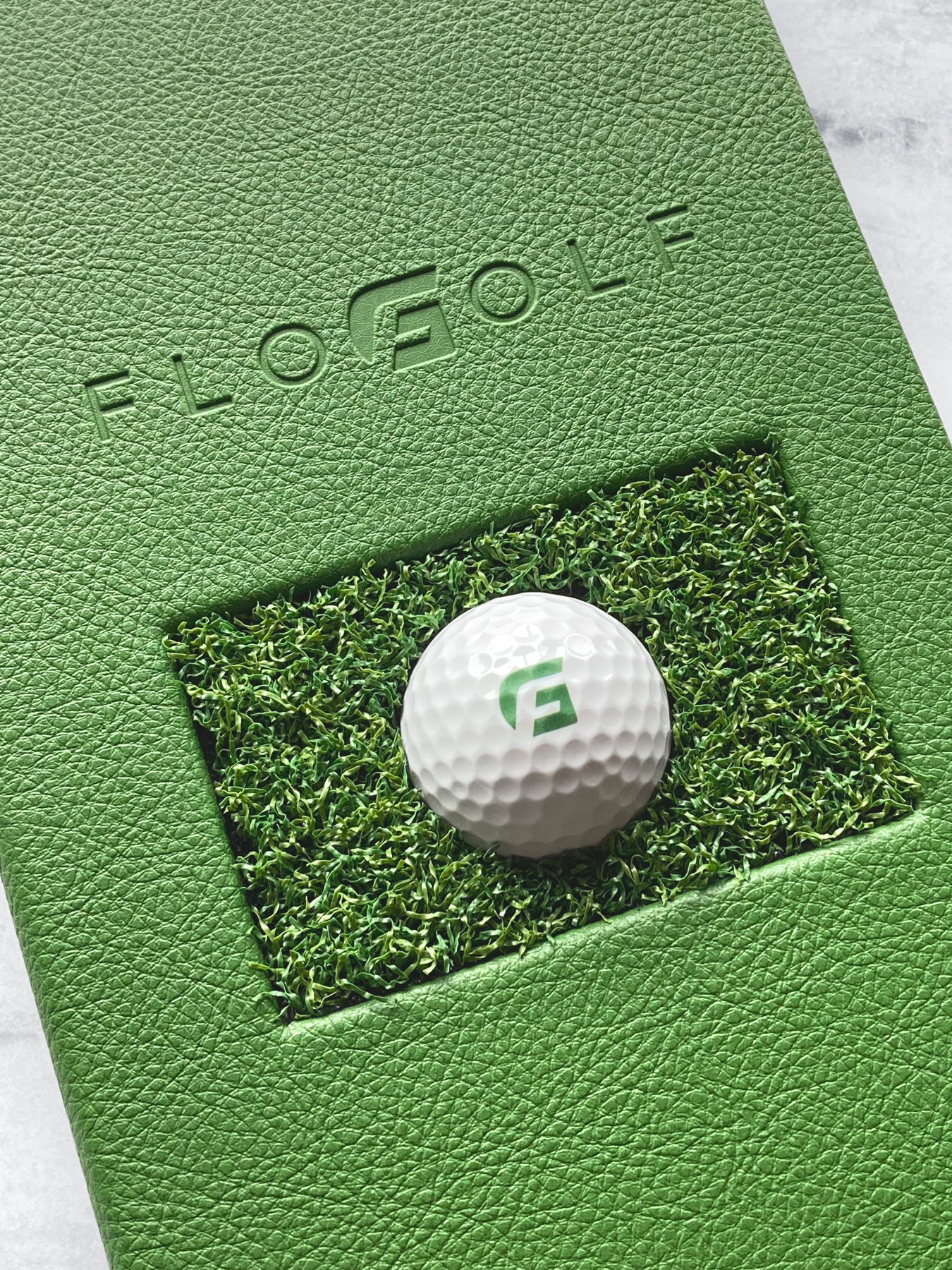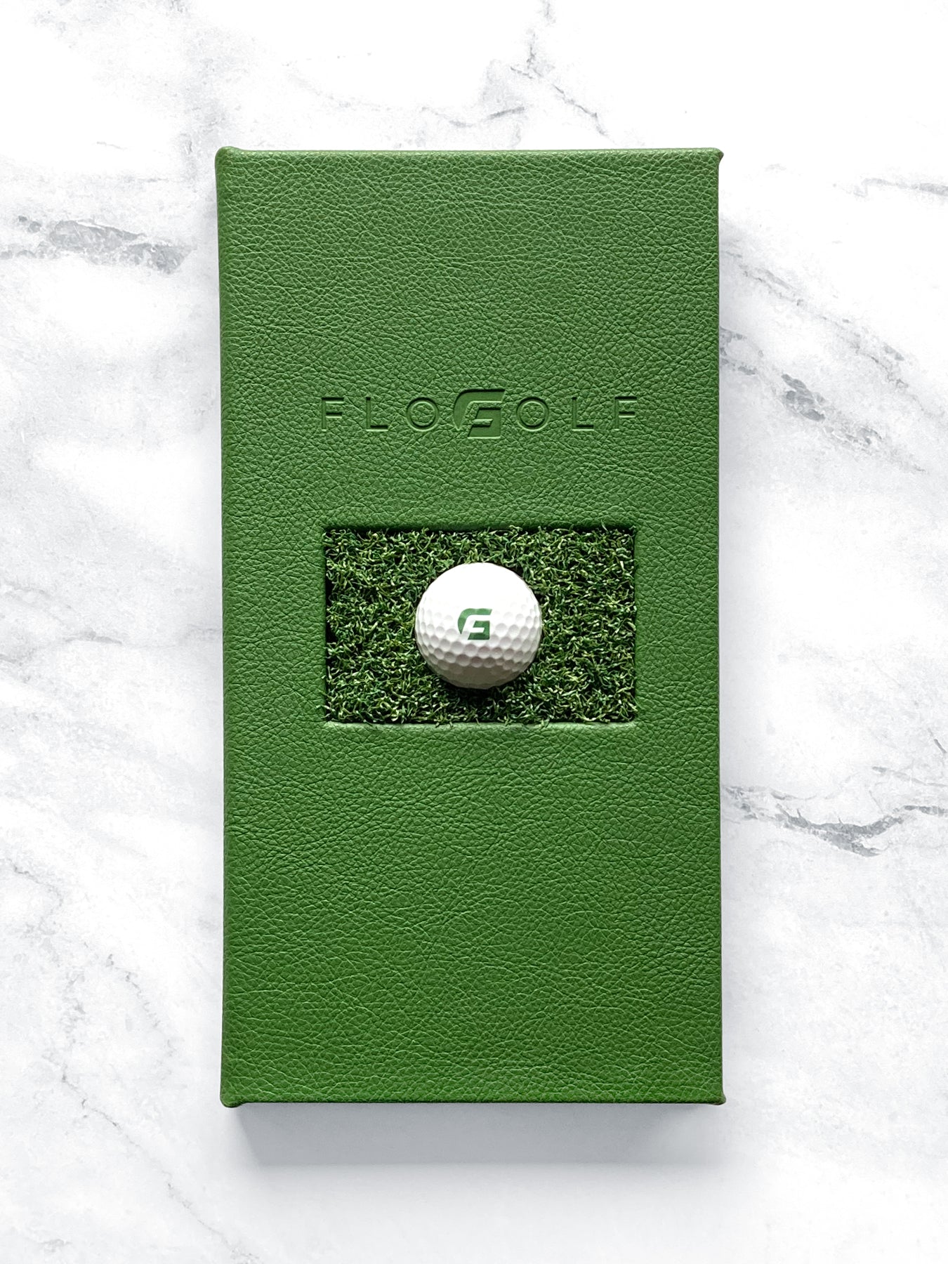 Green, faux leather menu cover with die-cut, turf filled window. Authentic golf ball sits inside turf. Green linen interior with photo pocket corners. Blind stamped logo on front cover above turf window.