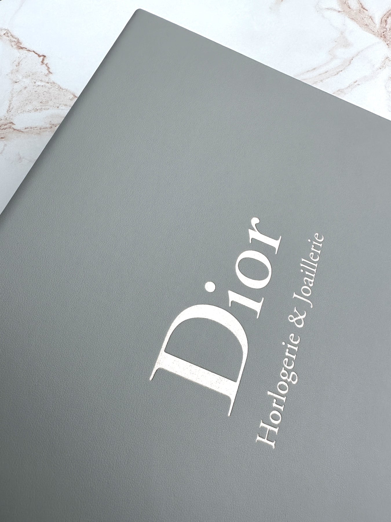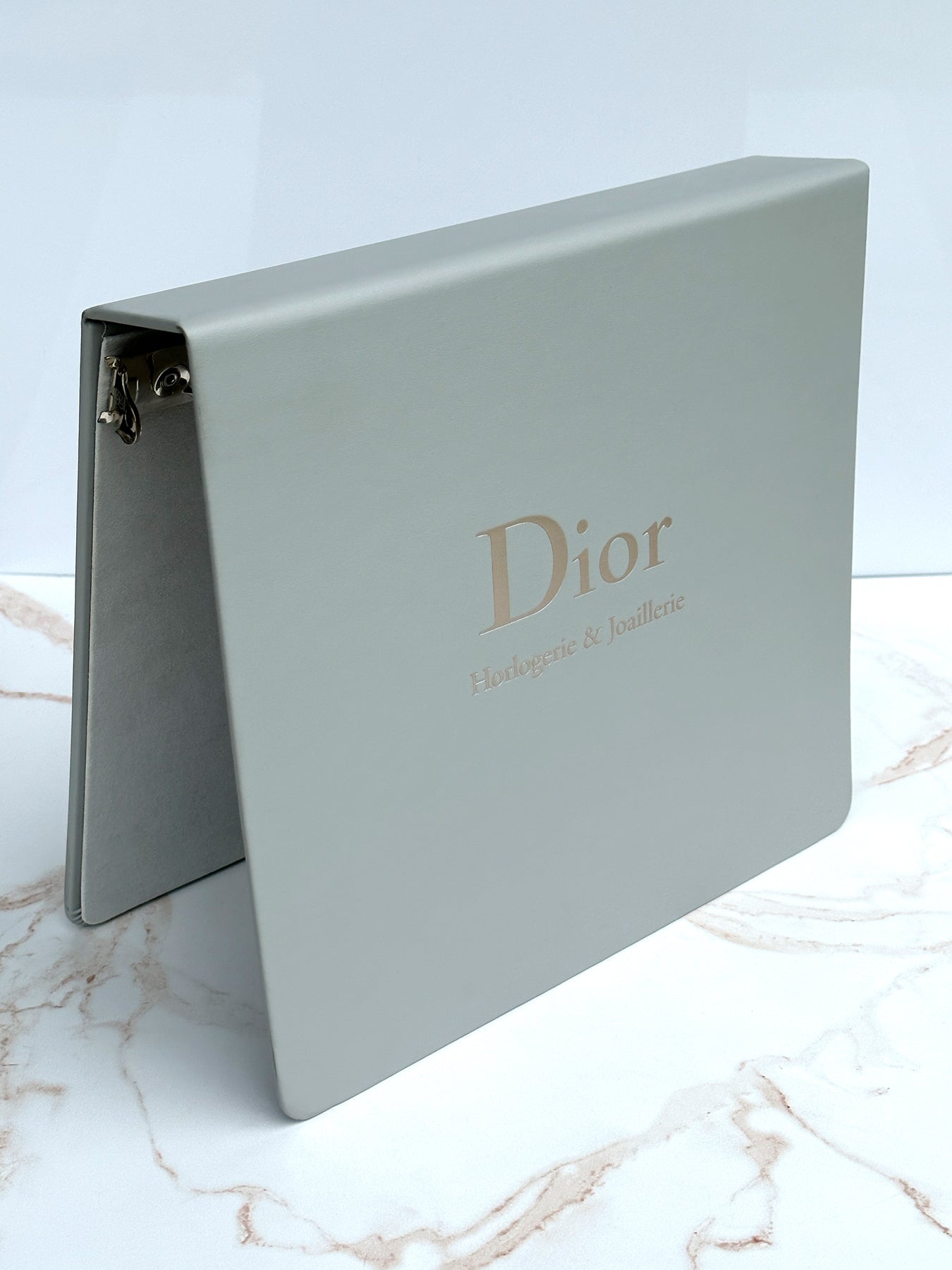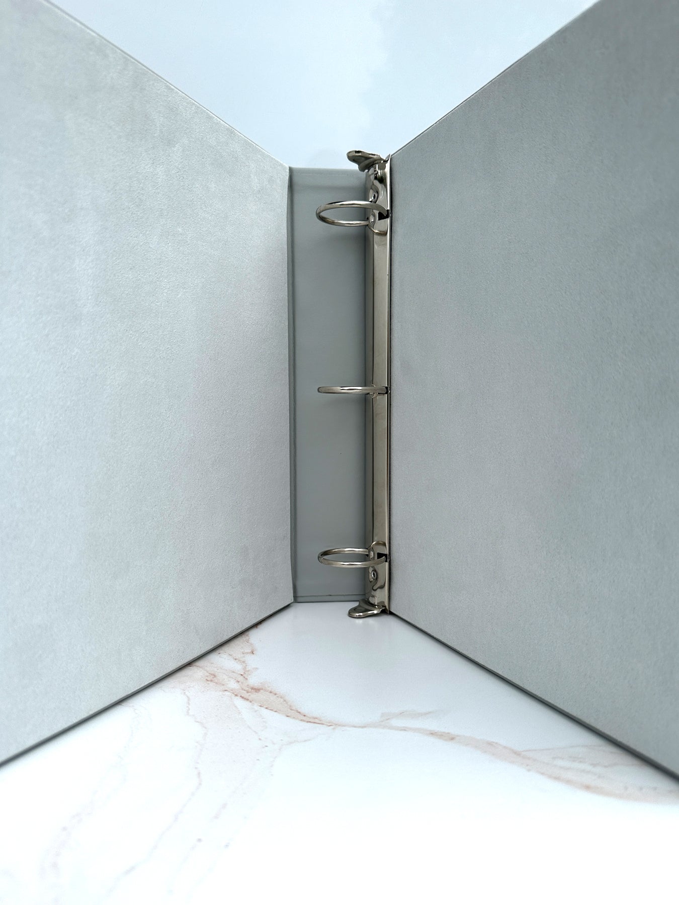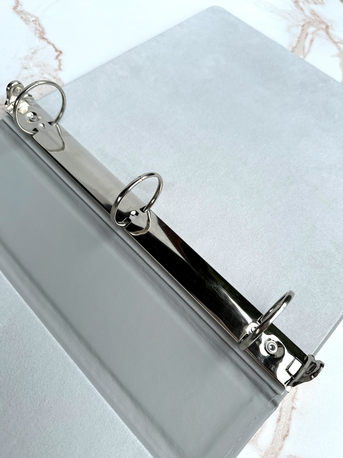 Silvery grey faux leather binder cover with complimenting grey interior. Large silver three-ring binder on inside back cover to hold pages. Silver foil logo on front cover.