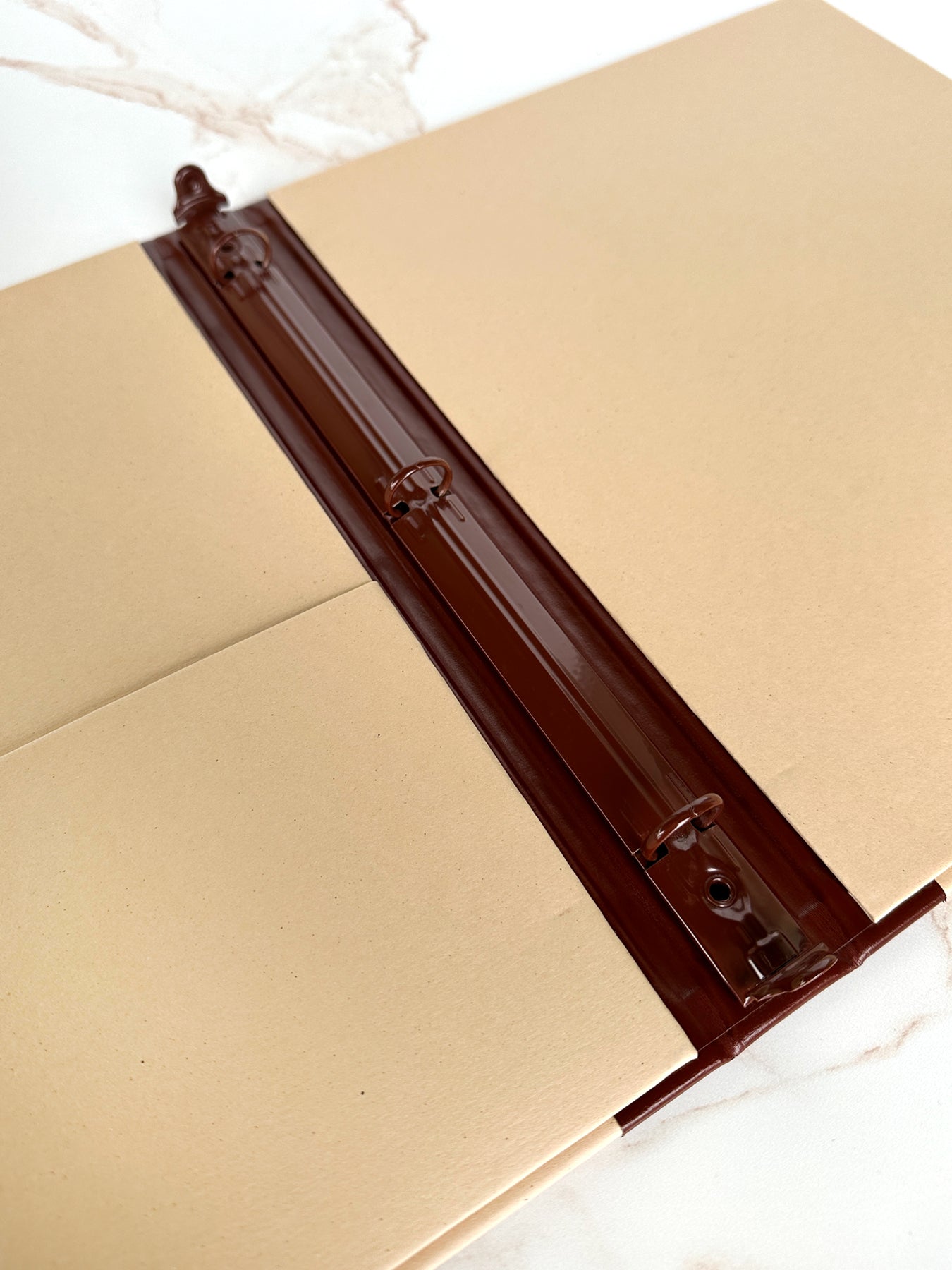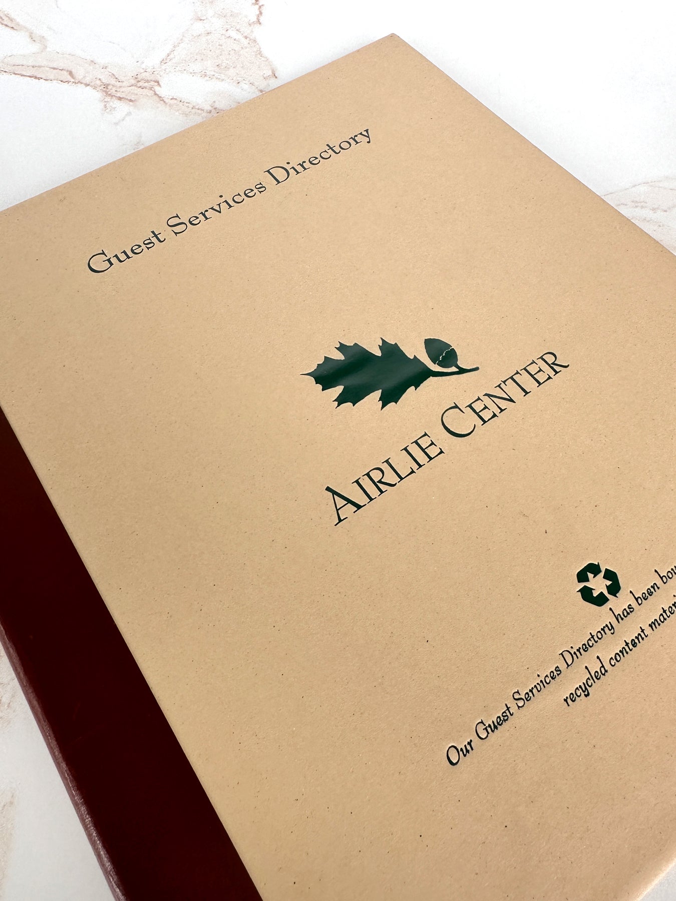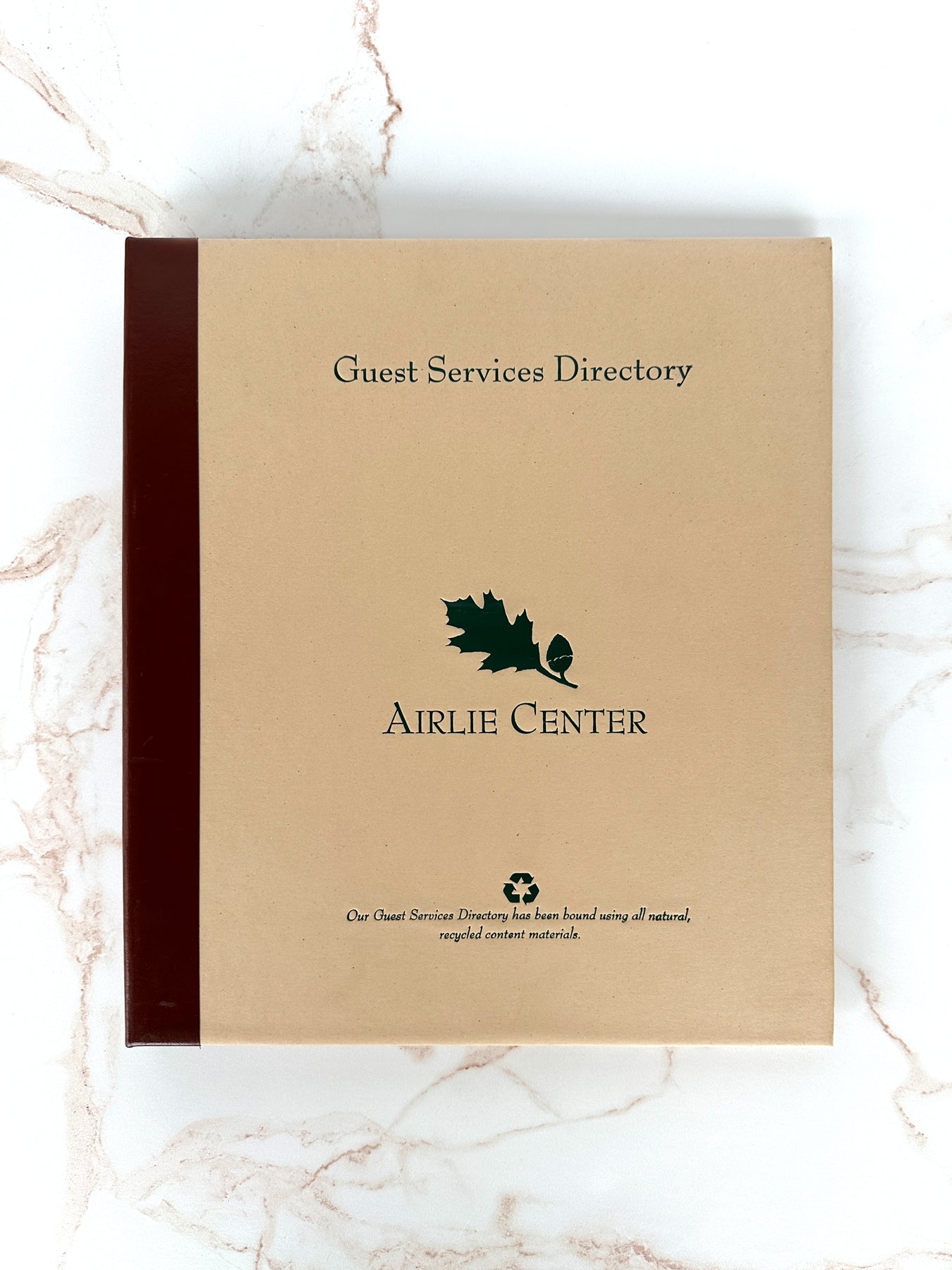 Foil stamped paper guest services directory with dark brown binding and matching three-ring binder in spine, to hold pages. Artwork and wording are foil stamped in dark green.
