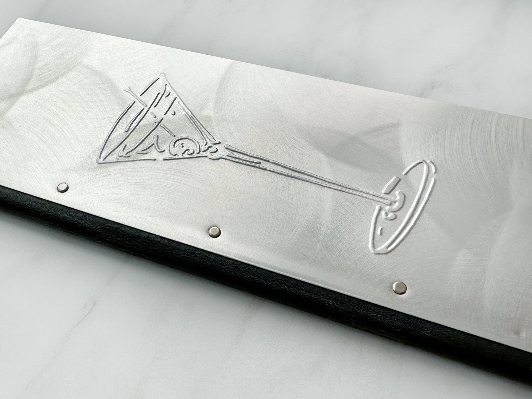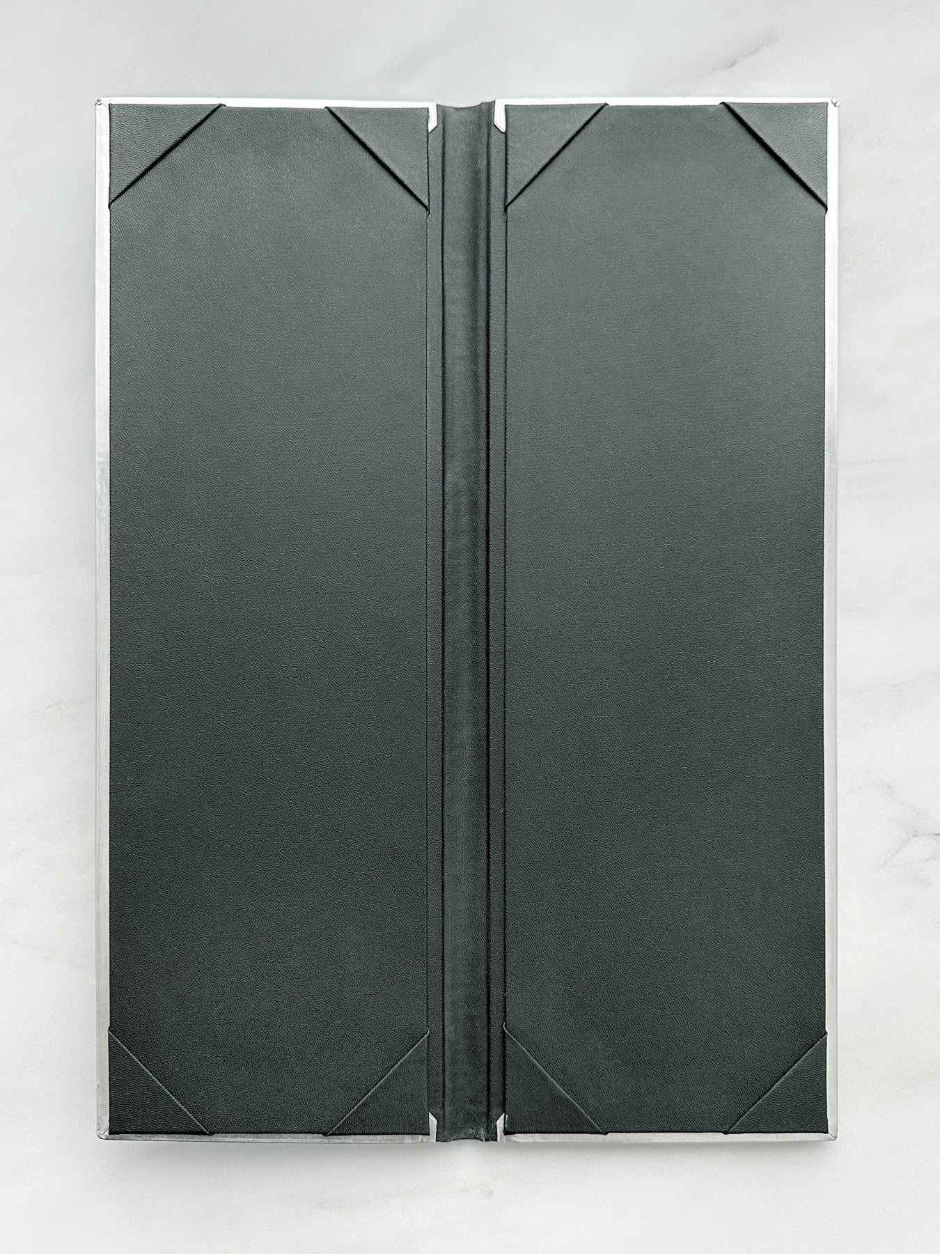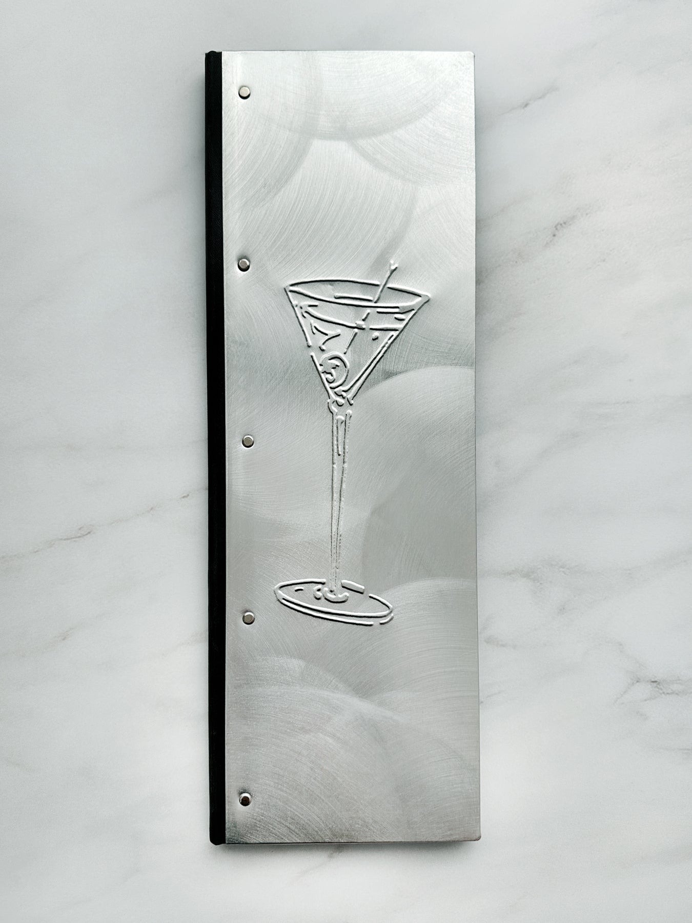 Aluminum menu cover riveted to black faux leather spine. Black leatherette interior with matching photo pocket corners. Embossed martini glass on front cover.